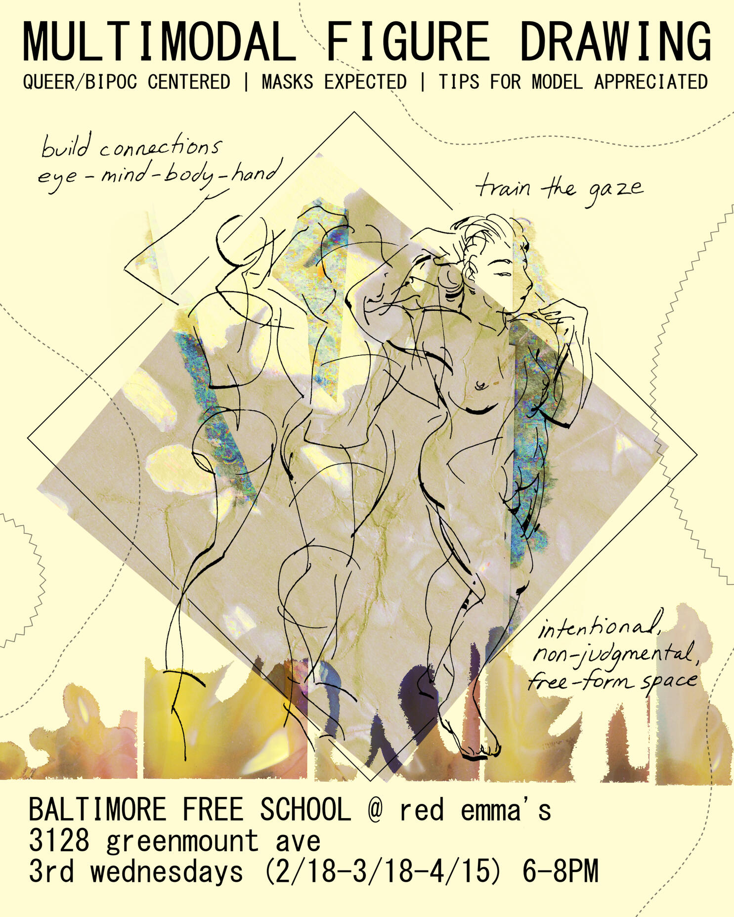 At the Baltimore Free School, 3128 Greenmount Ave on 3rd Wednesdays.Limited walk-ins available based on space.ADA accessible entrance to the Baltimore Free School is on Brentwood Ave.Email [email protected] with any further questions about accessibility or the event. If you are an interested in modeling or hosting a future session, please introduce yourself and your experiences with figure drawing and outside of it. Performing artists and athletes are very welcome!